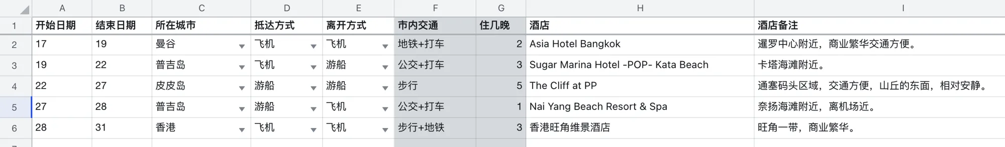 For tasks like this, the human brain isn’t as reliable as code. So, I built a spreadsheet tool. You fill in the table, and it auto-generates the itinerary overview, ensuring zero errors. You can simply copy it from the spreadsheet and paste it into your document: