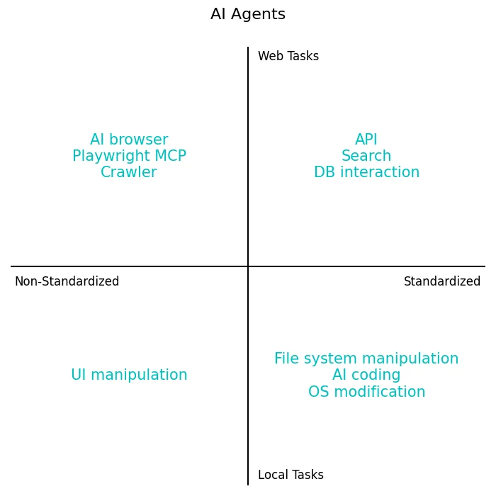 再回顾一下象限图,以上测试的还只是右边两个象限,Agents面临的任务主要是本地文件操作、网络请求这类标准化任务。